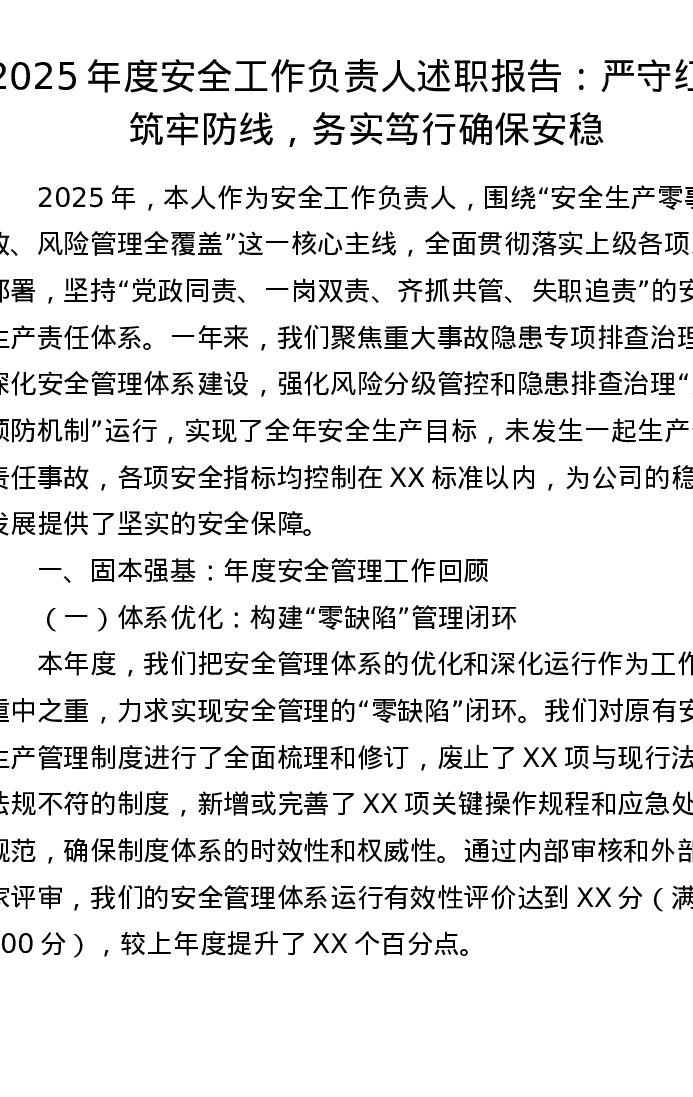 2025年度安全工作负责人述职报告:严守红线筑牢防线,务实笃行确保安稳