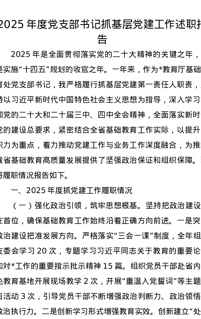 2025年度党支部书记抓基层党建工作述职报告