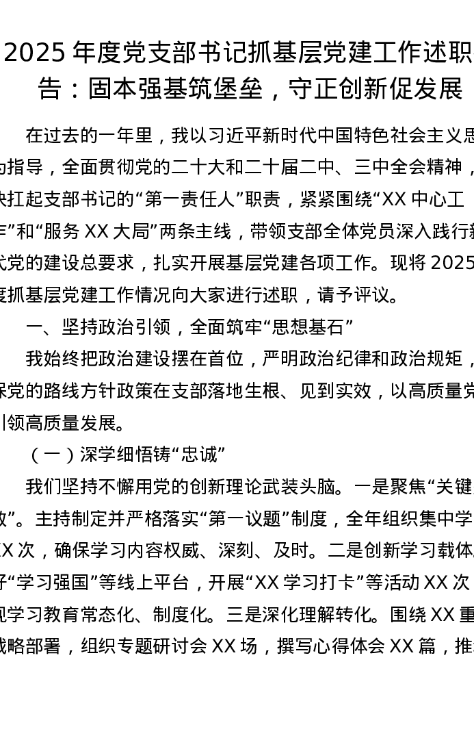 2025年度党支部书记抓基层党建工作述职报告:固本强基筑堡垒,守正创新促发展