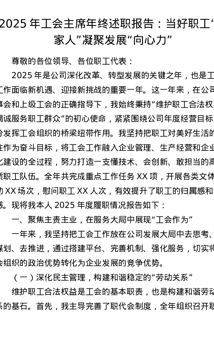 2025年工会主席年终述职报告:当好职工“娘家人” 凝聚发展“向心力”