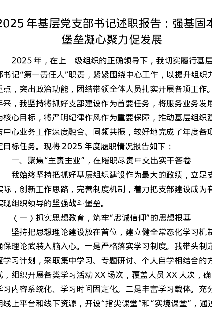 2025年基层党支部书记述职报告:强基固本筑堡垒 凝心聚力促发展