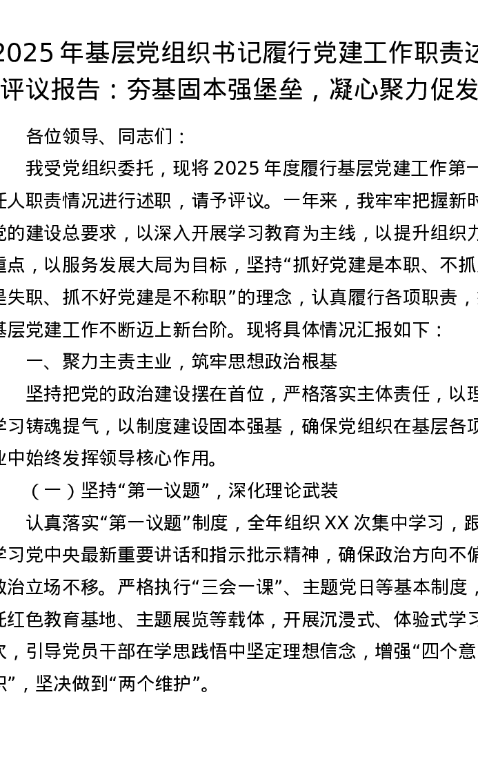 2025年基层党组织书记履行党建工作职责述职评议报告:夯基固本强堡垒,凝心聚力促发展