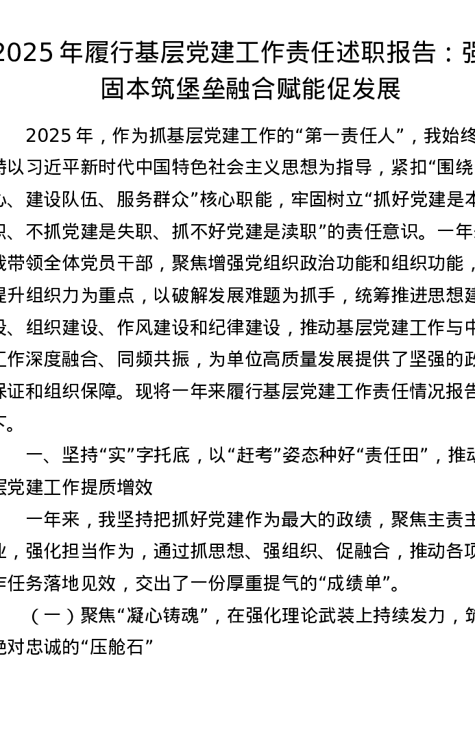 2025年履行基层党建工作责任述职报告:强基固本筑堡垒 融合赋能促发展