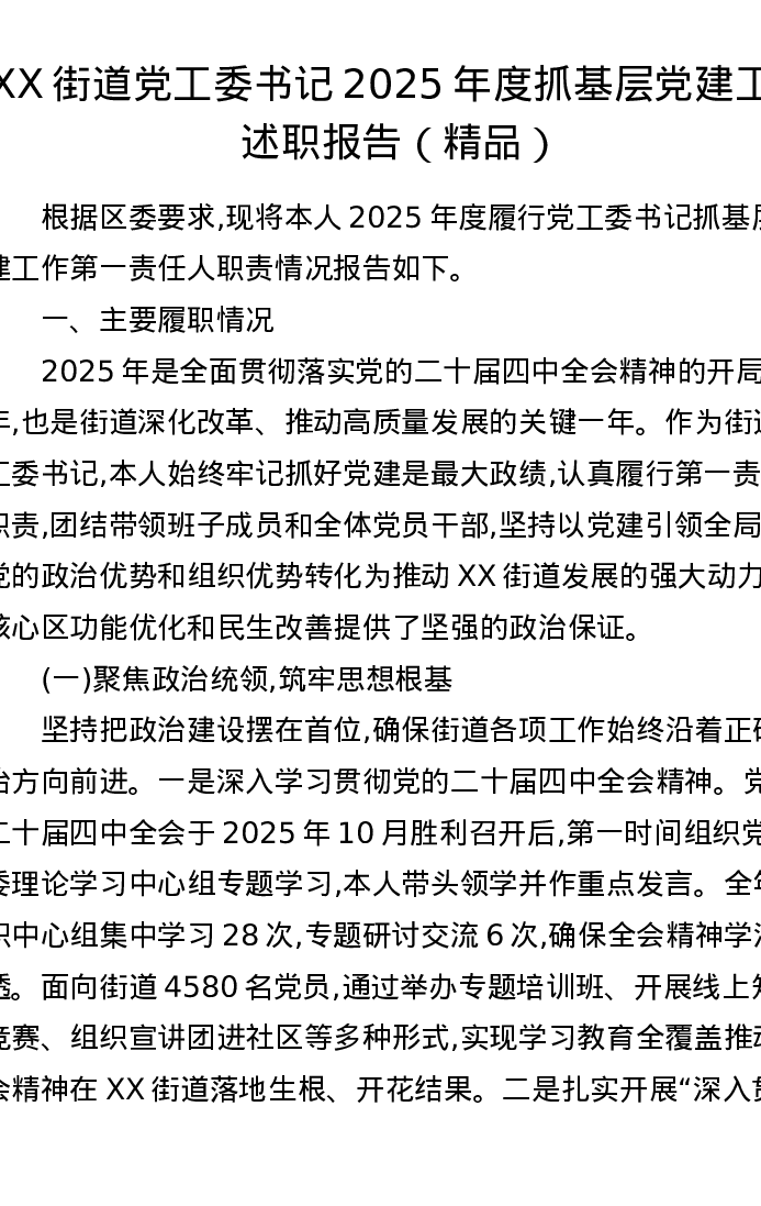 XX街道党工委书记2025年度抓基层党建工作述职报告