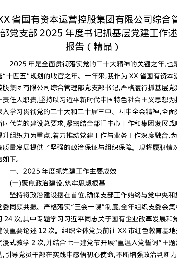 XX省国有资本运营控股集团有限公司综合管理部党支部2025年度书记抓基层党建工作述职报告