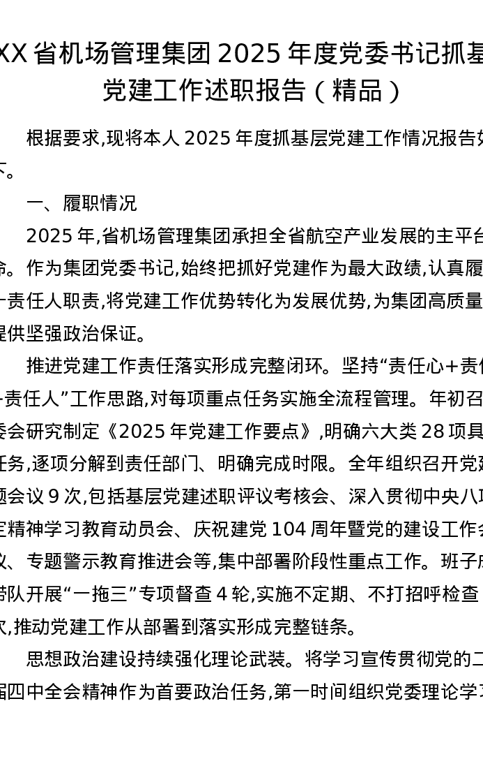 XX省机场管理集团2025年度党委书记抓基层党建工作述职报告
