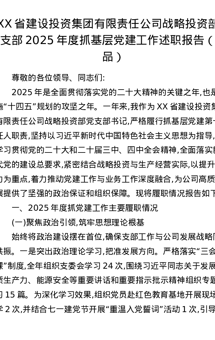 XX省建设投资集团有限责任公司战略投资部党支部2025年度抓基层党建工作述职报告