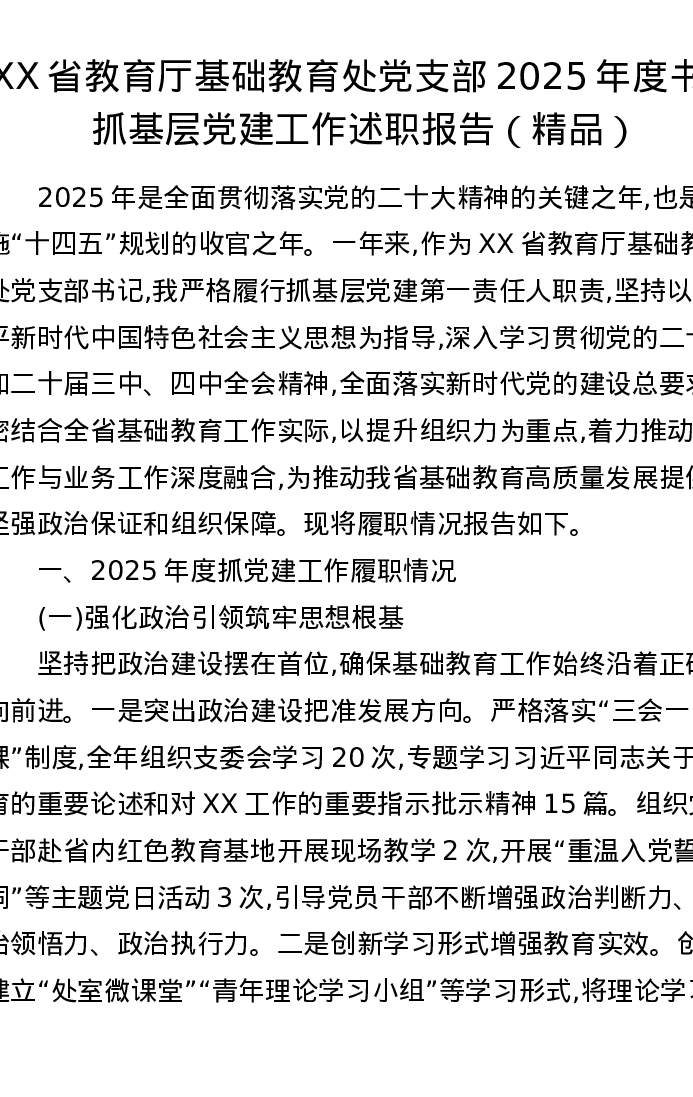 XX省教育厅基础教育处党支部2025年度书记抓基层党建工作述职报告