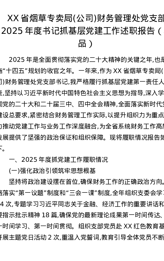 XX省烟草专卖局(公司)财务管理处党支部2025年度书记抓基层党建工作述职报告