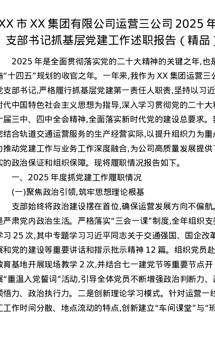 XX市XX集团有限公司运营三公司2025年度支部书记抓基层党建工作述职报告