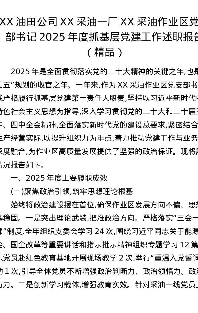 XX油田公司XX采油一厂XX采油作业区党支部书记2025年度抓基层党建工作述职报告