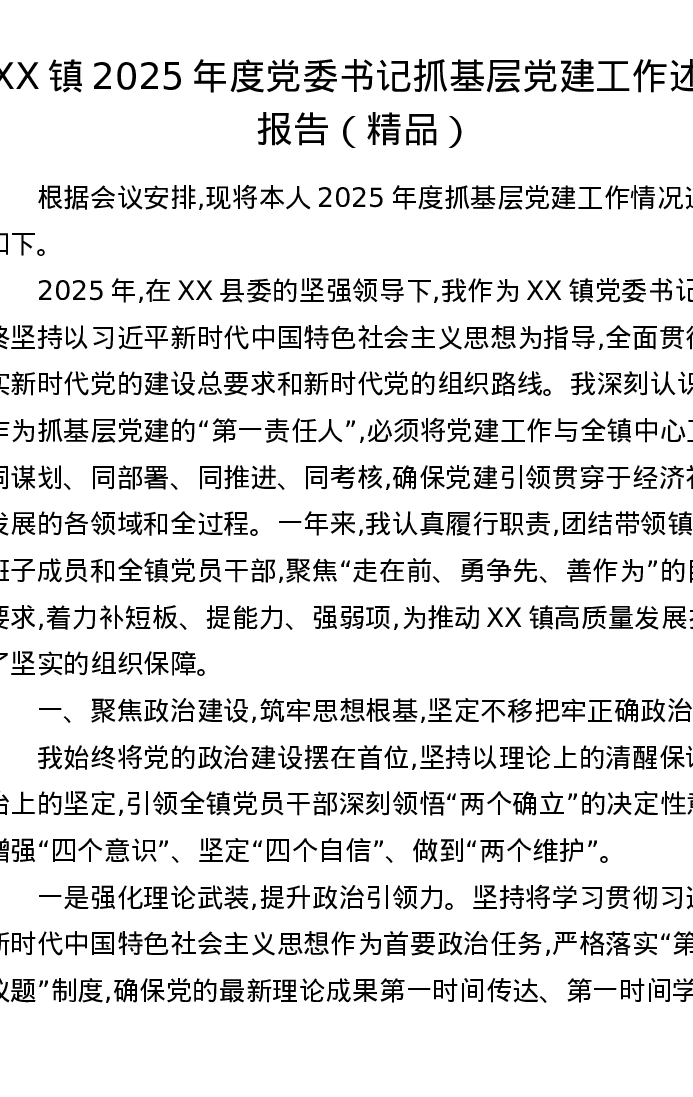 XX镇2025年度党委书记抓基层党建工作述职报告