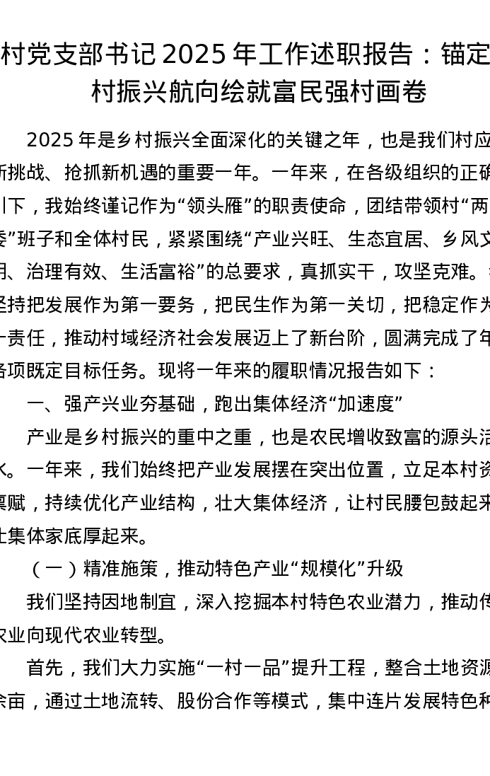 村党支部书记2025年工作述职报告:锚定乡村振兴航向 绘就富民强村画卷