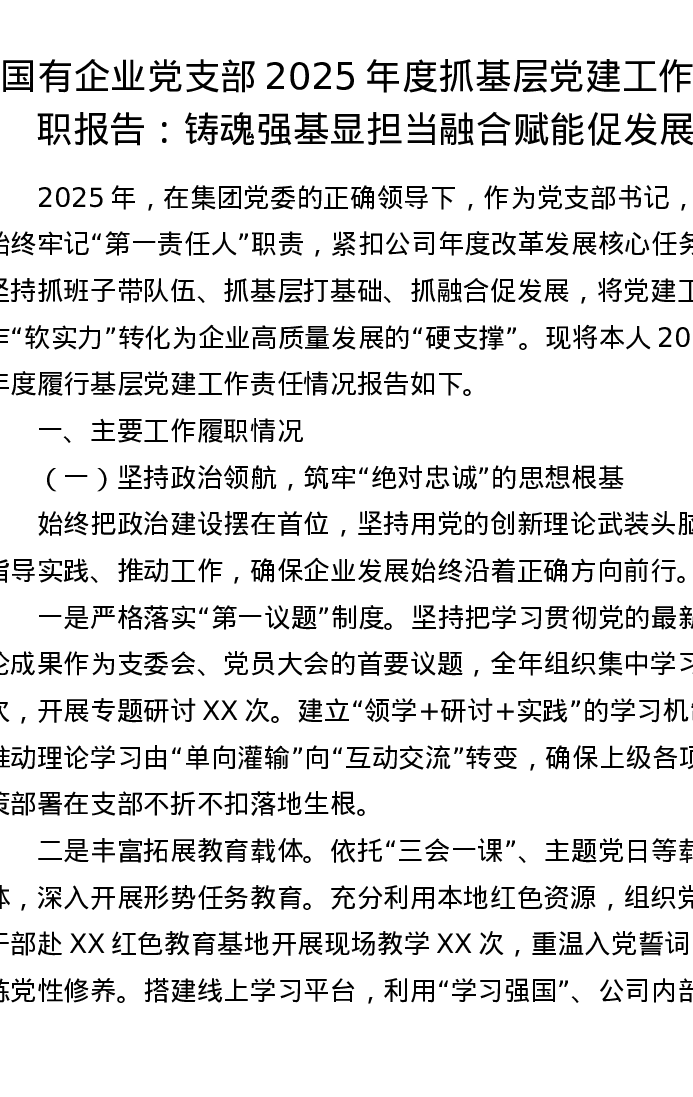 国有企业党支部2025年度抓基层党建工作述职报告:铸魂强基显担当 融合赋能促发展
