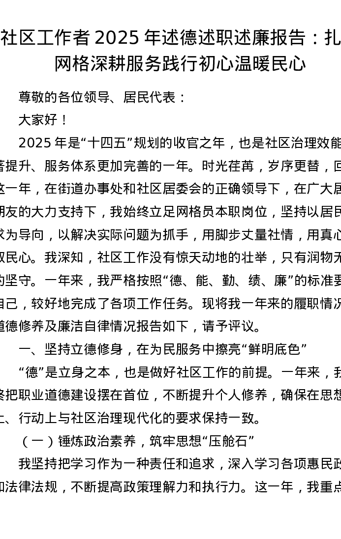 社区工作者2025年述德述职述廉报告:扎根网格深耕服务 践行初心温暖民心