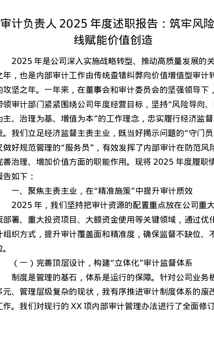 审计负责人2025年度述职报告:筑牢风险防线 赋能价值创造