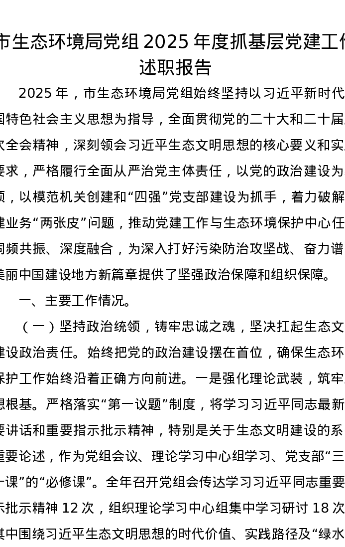 市生态环境局党组2025年度抓基层党建工作述职报告