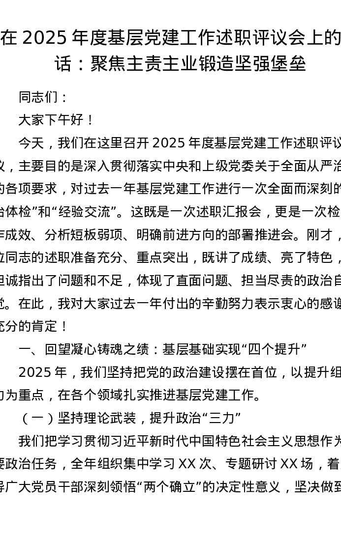 在2025年度基层党建工作述职评议会上的讲话:聚焦主责主业 锻造坚强堡垒