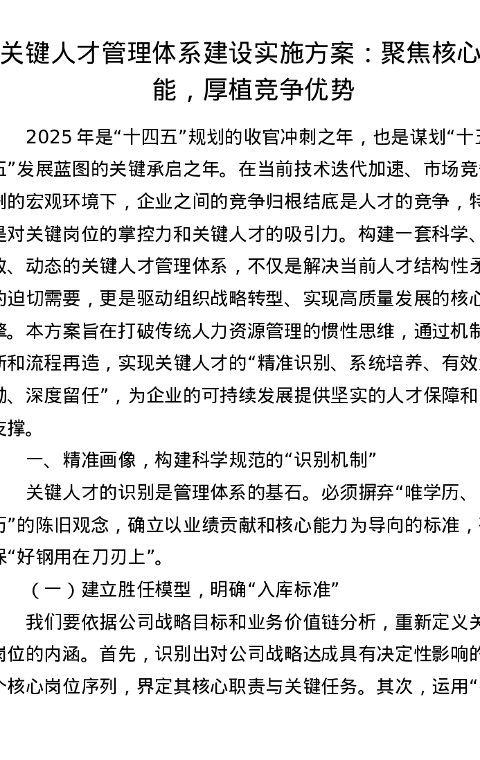 关键人才管理体系建设实施方案:聚焦核心动能,厚植竞争优势
