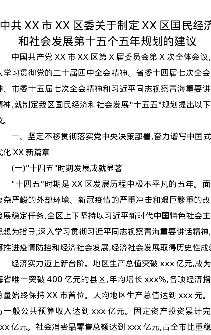 中共XX市XX区委关于制定XX区国民经济和社会发展第十五个五年规划的建议2