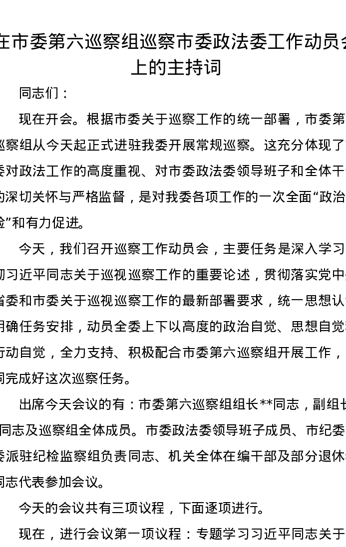 在市委第六巡察组巡察市委政法委工作动员会上的主持词