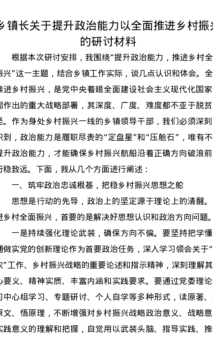 乡镇长关于提升政治能力以全面推进乡村振兴的研讨材料