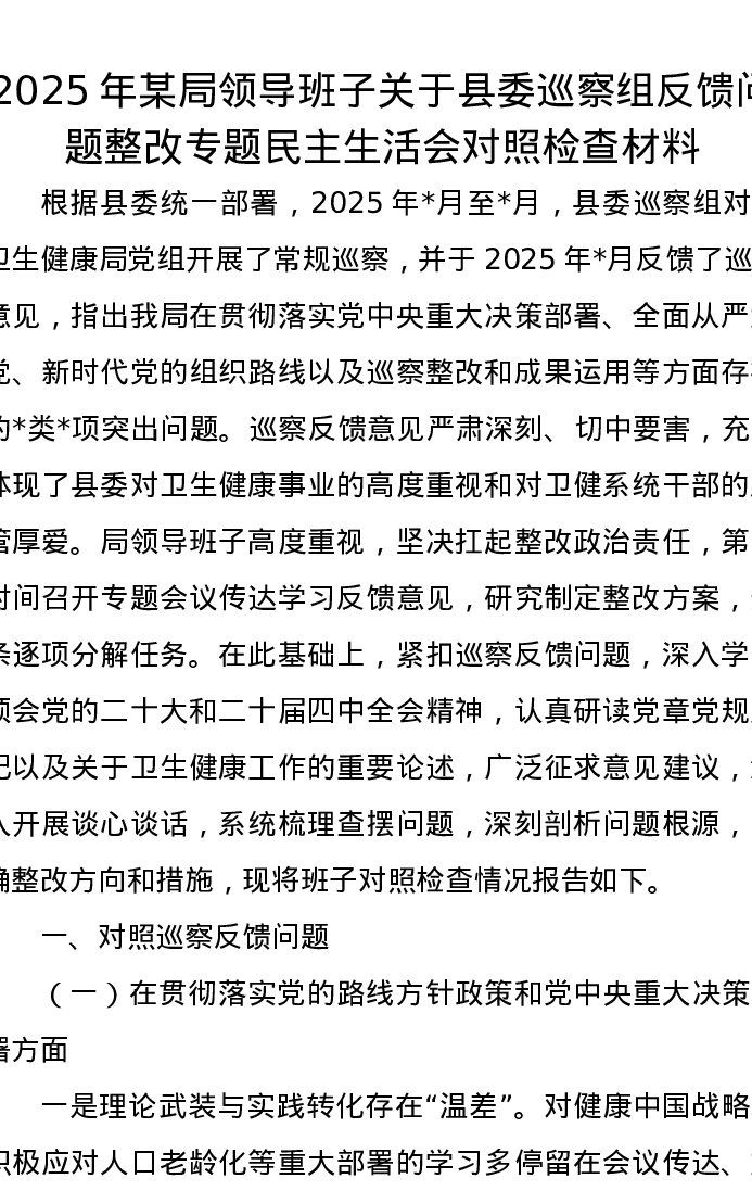 2025年某局领导班子关于县委巡察组反馈问题整改专题xxxxx对照检查材料