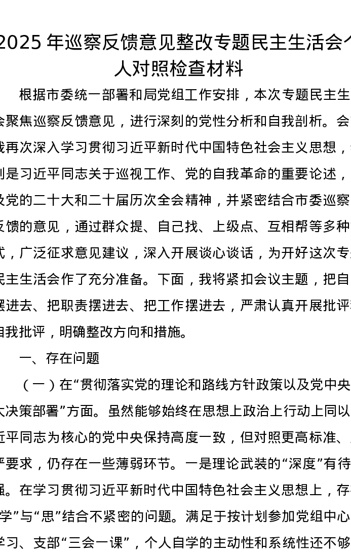2025年巡察反馈意见整改专题xxxxx个人对照检查材料