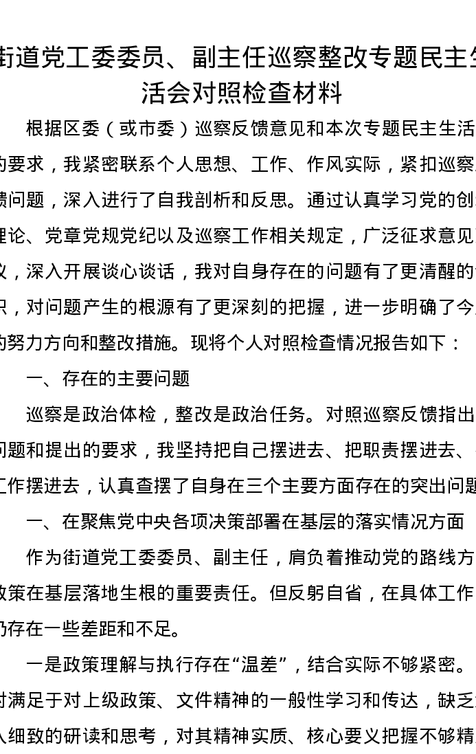街道党工委委员、副主任巡察整改专题xxxxx对照检查材料