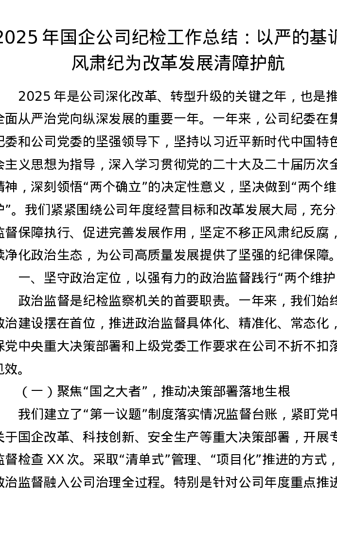 2025年国企公司纪检工作总结:以严的基调正风肃纪 为改革发展清障护航