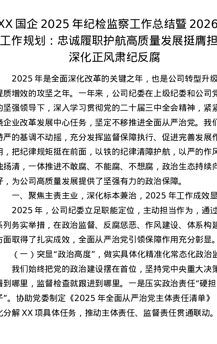 XX国企2025年纪检监察工作总结暨2026年工作规划:忠诚履职护航高质量发展 挺膺担当深化正风肃纪反腐