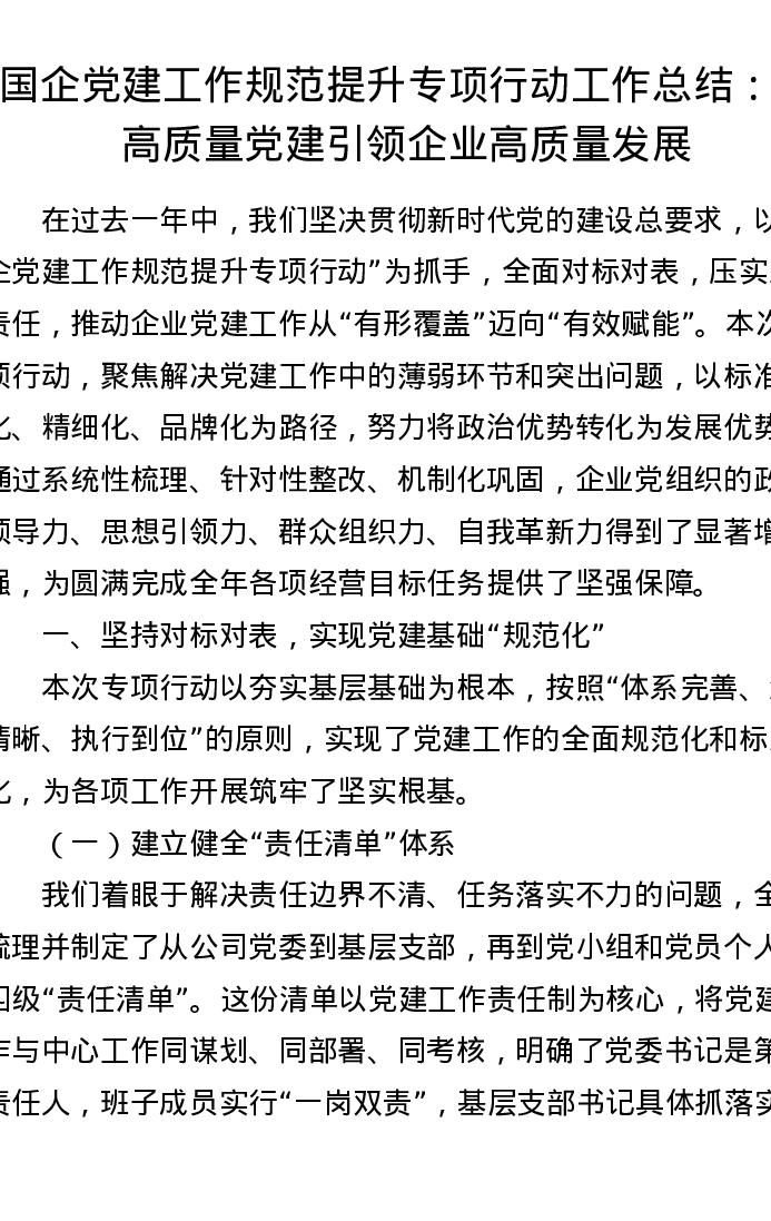 国企党建工作规范提升专项行动工作总结:以高质量党建引领企业高质量发展