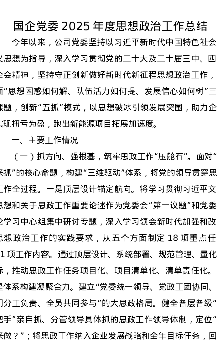 国企党委2025年度思想政治工作总结