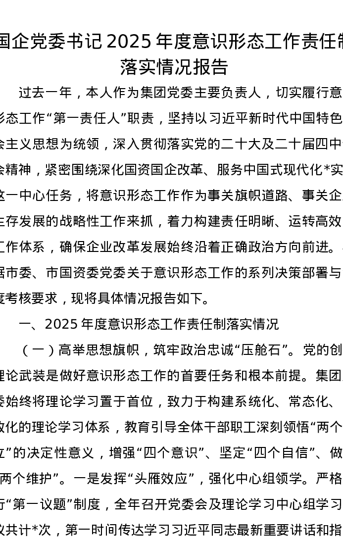 国企党委书记2025年度意识形态工作责任制落实情况报告