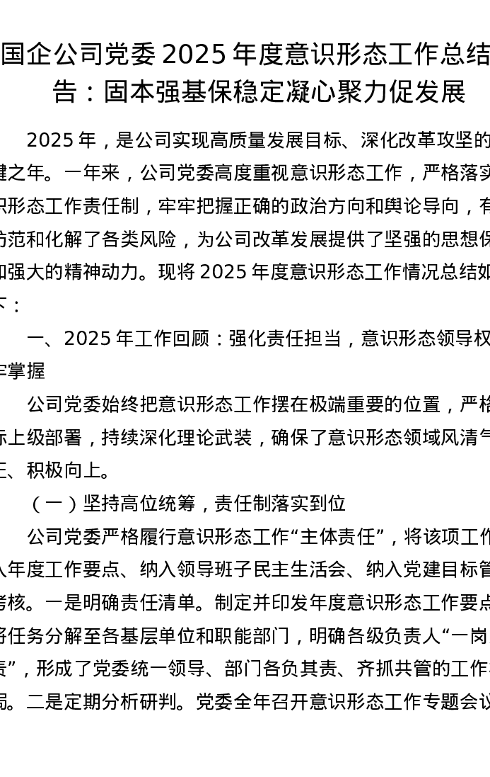 国企公司党委2025年度意识形态工作总结报告:固本强基保稳定 凝心聚力促发展