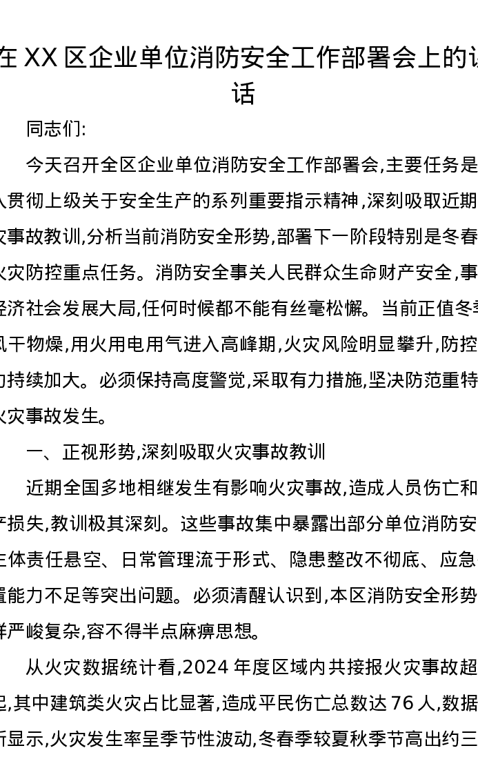 在XX区企业单位消防安全工作部署会上的讲话