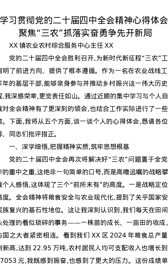 学习贯彻党的二十届四中全会精神心得体会聚焦“三农”抓落实奋勇争先开新局