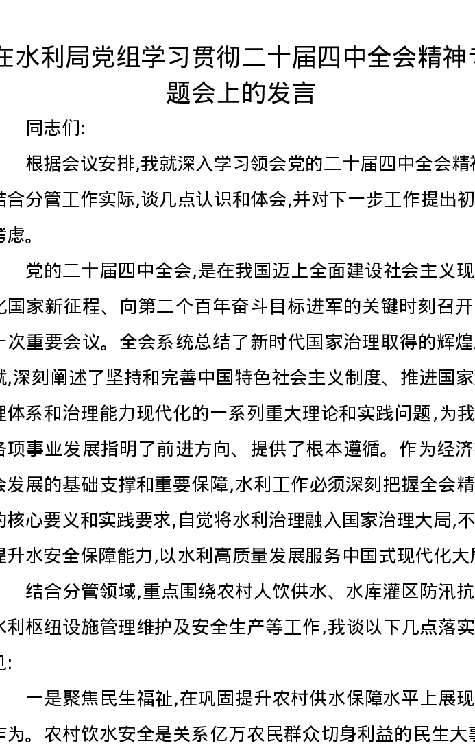 在水利局党组学习贯彻二十届四中全会精神专题会上的发言