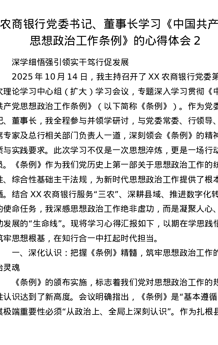 农商银行党委书记、董事长学习《中国共产党思想政治工作条例》的心得体会2
