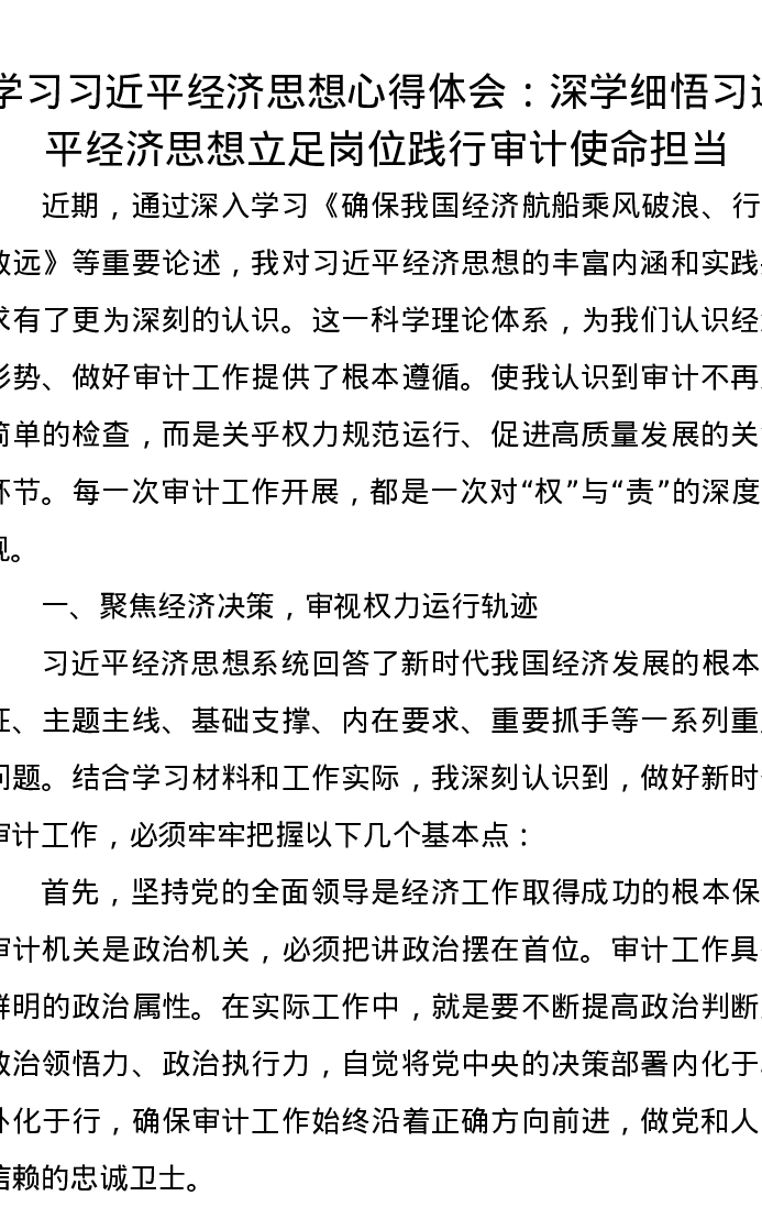 学习习近平经济思想心得体会:深学细悟习近平经济思想立足岗位践行审计使命担当