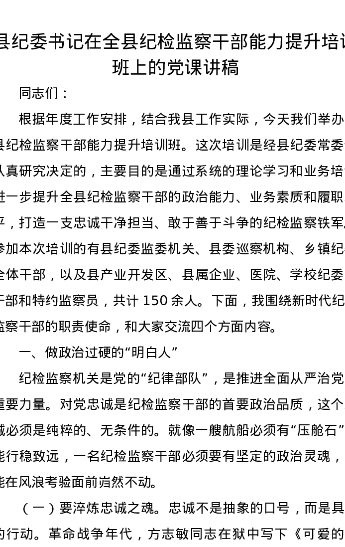 县纪委书记在全县纪检监察干部能力提升培训班上的党课讲稿