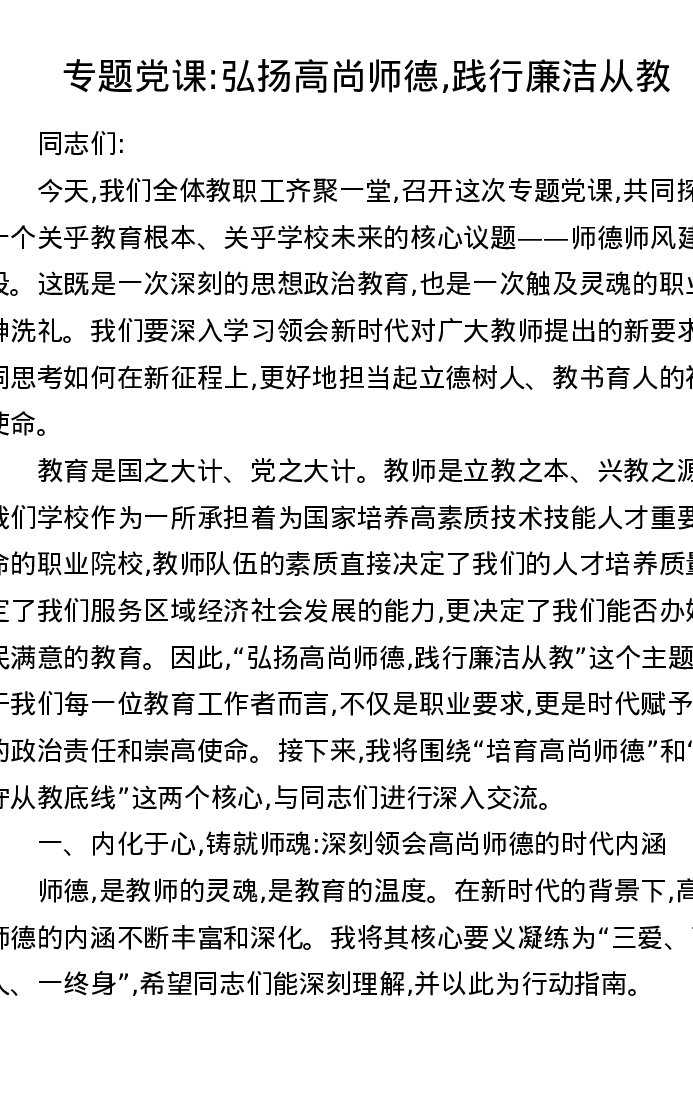 专题党课讲稿:弘扬高尚师德,践行廉洁从教