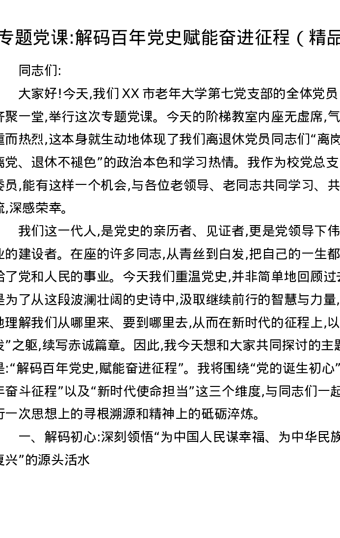 专题党课讲稿:解码百年党史赋能奋进征程