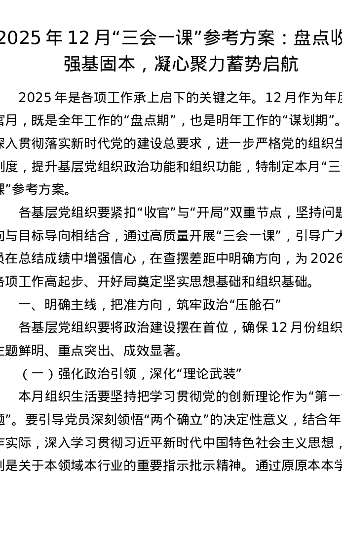 2025年12月“三会一课”参考方案:盘点收官强基固本,凝心聚力蓄势启航