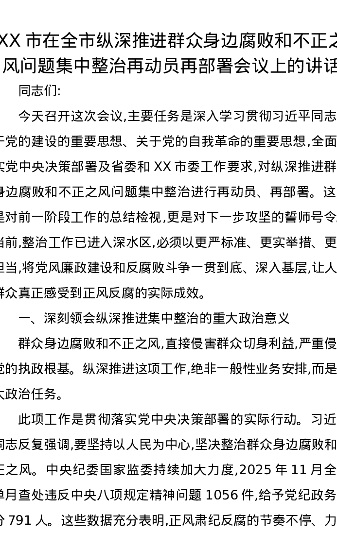 XX市在全市纵深推进群众身边腐败和不正之风问题集中整治再动员再部署会议上的讲话