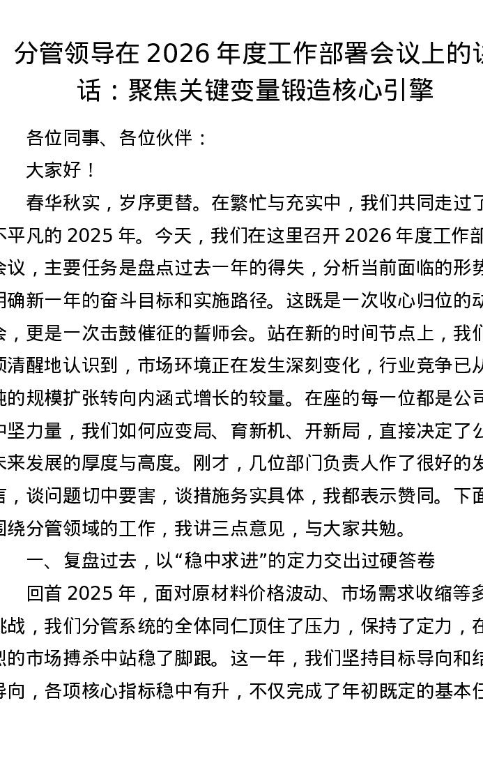 分管领导在2026年度工作部署会议上的讲话:聚焦关键变量 锻造核心引擎