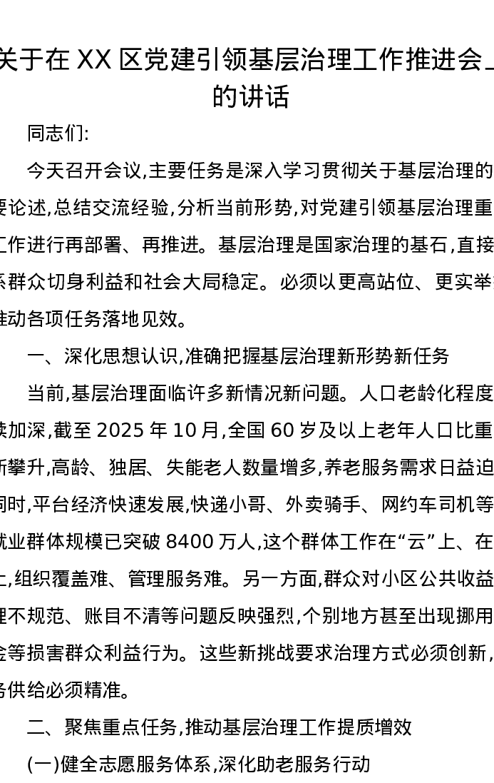 关于在XX区党建引领基层治理工作推进会上的讲话