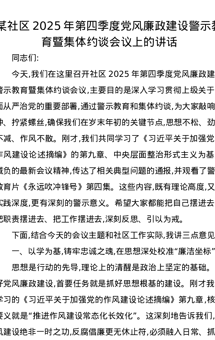某社区2025年第四季度党风廉政建设警示教育暨集体约谈会议上的讲话