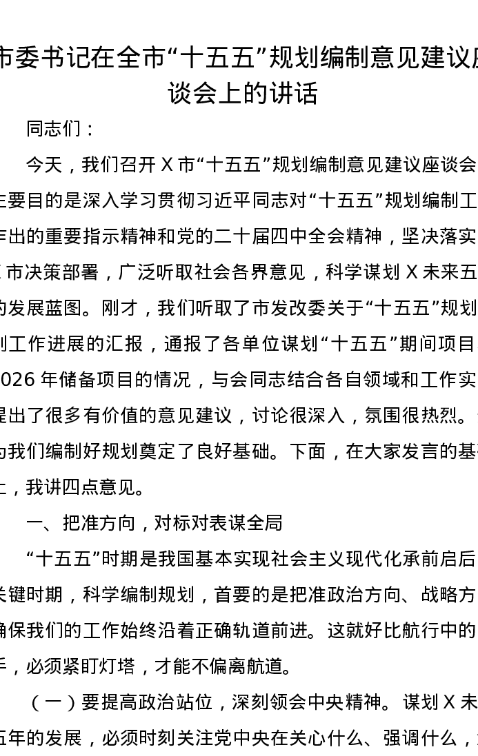 市委书记在全市“十五五”规划编制意见建议座谈会上的讲话