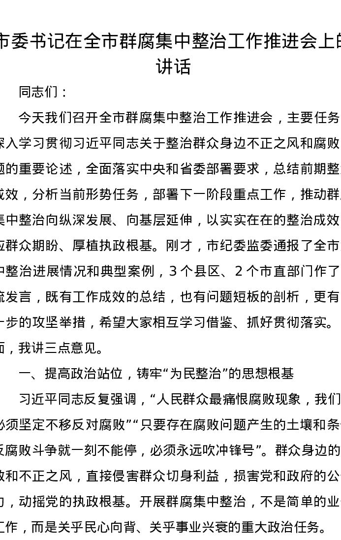 市委书记在全市群腐集中整治工作推进会上的讲话